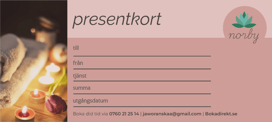 Att ge bort ett presentkort till en behandling är ett enkelt sätt att sprida lite lugn, omsorg och välbefinnande. Mottagaren kan själv välja den behandling som passar bäst – fotvård eller underbensmassage.