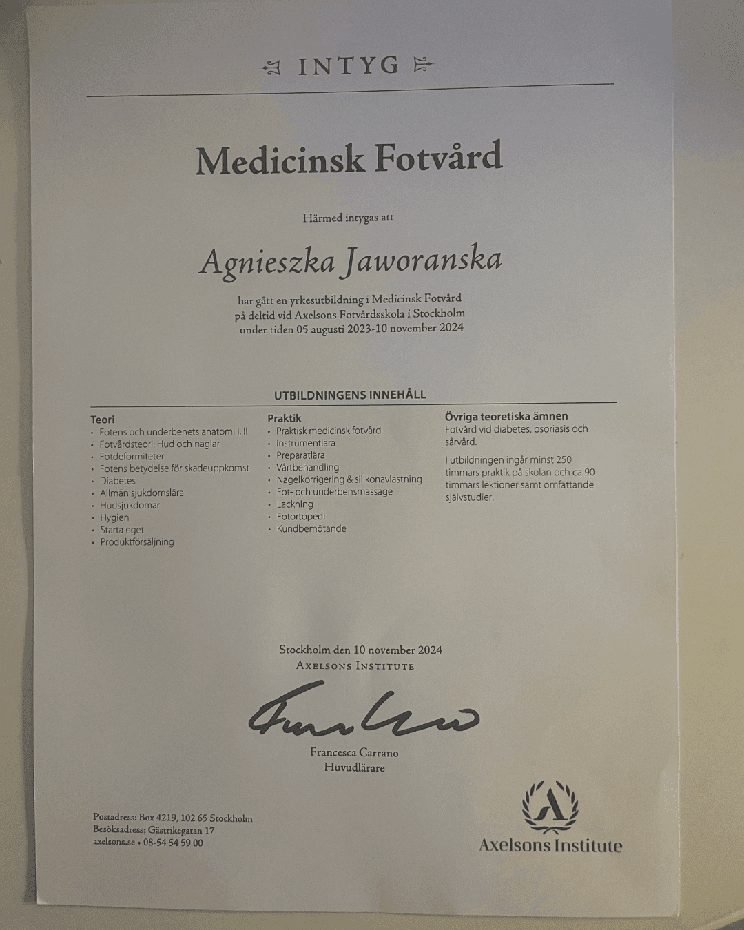 Eftersom varje fot är unik, anpassar jag alltid behandlingen efter varje persons individuella behov. Syftet är att erbjuda trygg och personlig fotvård som verkligen gör skillnad i vardagen.